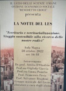 Il progetto prevede che ciascun istituto scolastico personalizzi la serata con le proprie iniziative sul tema, dato ogni anno, tenendo ferma la scelta comune di coinvolgere soprattutto gli studenti, che devono essere i veri protagonisti dell’evento. Il Liceo Benedetto Croce di Avezzano, scuola capofila della Rete dei Licei Economici Sociali Abruzzo e Molise, ha realizzato, per la Notte Bianca dei LES, prevista il 28 ottobre 2022, presso l’Aula Magna dell’Istituto dalle ore 16, una tavola rotonda e una serie di laboratori presentati dai ragazzi del LES e dagli amici del LES, per conoscere, promuovere e valorizzare il nostro territorio in chiave civica, economico e sociale. “Territorio e territorializzazione. Viaggio sostenibile alla ricerca delle nostre radici”, il tema scelto quest’anno. Ad accompagnare gli studenti del Croce in questo viaggio storico-culturale e sociale alla scoperta e valorizzazione dei luoghi del territorio marsicano, saranno il dirigente scolastico, prof. Attilio D’Onofrio, gli scrittori Emma Pomilio e Francesco Proia, l’avvocato Salvatore Braghini e la prof.ssa Gigliola Ciaccia, da quest’anno in quiescenza, che passerà il testimone di docente referente della rete LES Abruzzo -Molise alla professoressa Laura Renzi. Il programma della serata approfondirà dunque temi sociali, economici, dall’ottica storica, che ha visto un passaggio “dall’acqua alla terra”, agli aspetti culturali e multiculturali, ma anche con contributi su tematiche di attualità legate al riciclo, con interviste effettuate a scuola e sul territorio, fino all’interrogativo che i ragazzi si stanno ponendo “Oggi il tribunale… e domani?”. Nell’arco della serata è previsto un collegamento online con il liceo Galanti di Campobasso, per i saluti e la condivisione dell’analoga manifestazione. Allieterà la manifestazione il gruppo musicale del liceo Croce abilmente diretto dalla professoressa Erika Gigli.