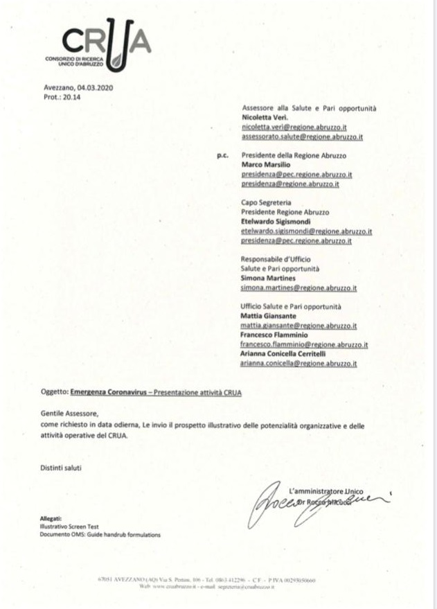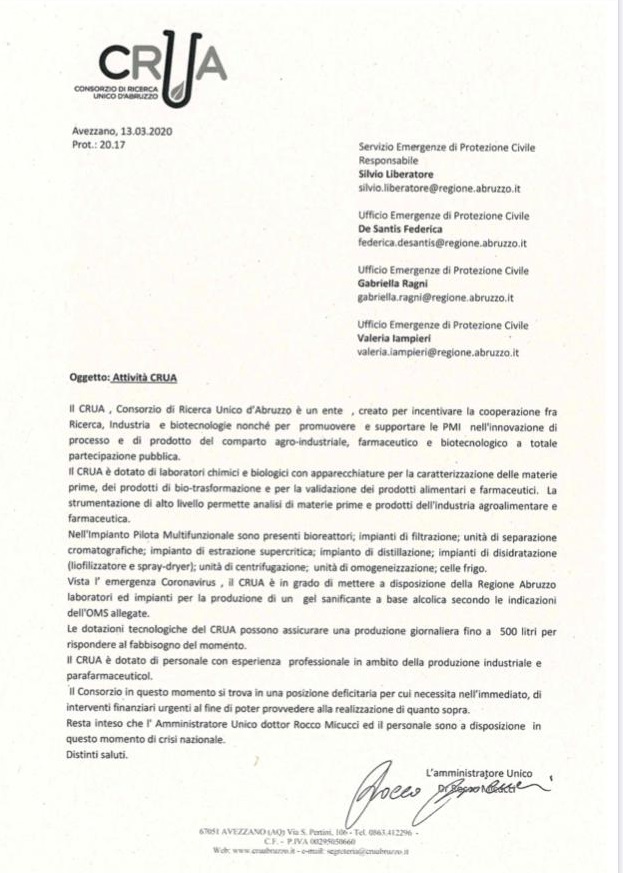 Eppure qualche soluzione esiste, quella di utilizzare il CRUA di Avezzano, società interamente a capitale pubblico che, ricordiamo, potrebbe processare al costo esiguo di circa 10 euro un tampone per la ricerca degli anticorpi del Coronavirus, possibilità suffragata da una mai contestata documentazione (che alleghiamo a questa nota) che il commissario regionale, Rocco Micucci, ha inviato alla Regione Abruzzo.