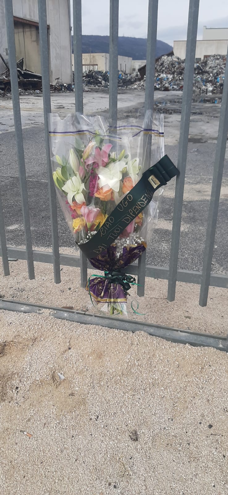 Un mazzo di fiori all’ingresso del Centro riciclo srl che si trova nel nucleo industriale di Avezzano.