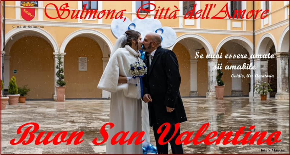 Per l’occasione il Comune del capoluogo peligno ha creato una cartolina per augurare un buon San Valentino a tutti gli innamorati, proprio con l’immagine dei due neo sposi: “Sulmona, Città dell’Amore”, si legge in alto e poi – immancabile – una frase di Ovidio “Se vuoi essere amato sii amabile”.