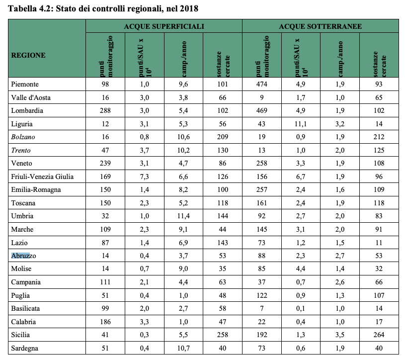 E l’Abruzzo? Come rileva la stessa ISPRA, esistono enormi differenze tra le regioni nel livello di qualità del monitoraggio. Purtroppo l’Abruzzo non ne esce bene visto che, almeno fino al 2018 non ha risolto i problemi che denunciamo da anni e, cioè, il bassissimo numero di sostanze cercate, 53. Solo 5 regioni fanno peggio di noi. Per dire, la Sicilia ricerca nei fiumi ben 258 tipi di pesticidi, il Lazio 143, la provincia di Bolzano 209.