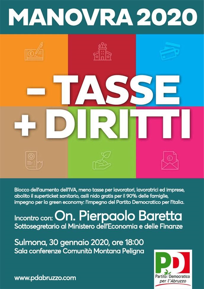 Il prossimo giovedì 30 gennaio 2020 alle ore 18 a Sulmona, nella Sala conferenze della Comunità Montana peligna, il Pd Abruzzo discuterà della manovra finanziaria 2020 con il sottosegretario al Ministero dell’Economia e delle Finanze Pierpaolo Baretta.
