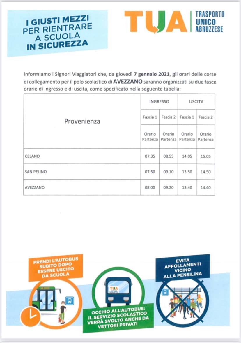 In tabella gli orari dell’azienda di trasporto TUA divisi in due fasce orarie di ingresso e di uscita.