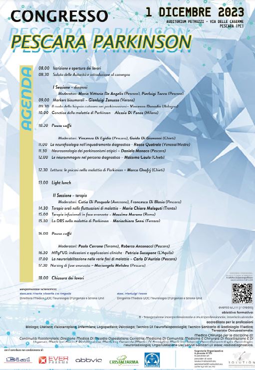 E’ fissato per il giorno 1 dicembre 2023, presso l’Auditorium Petruzzi in via delle Caserme 60 a Pescara, il congresso scientifico incentrato sulla patologia neurodegenerativa