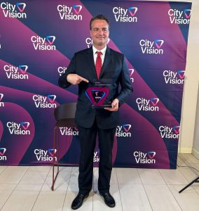 Il sindaco dell’Aquila, Pierluigi Biondi, si congratula con Oscar Cicchetti per la nomina a presidente del Consiglio di amministrazione di INWIT, società leader nel settore